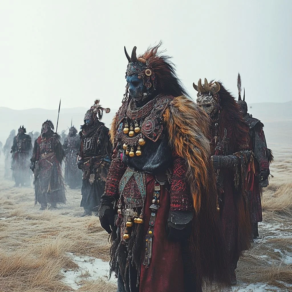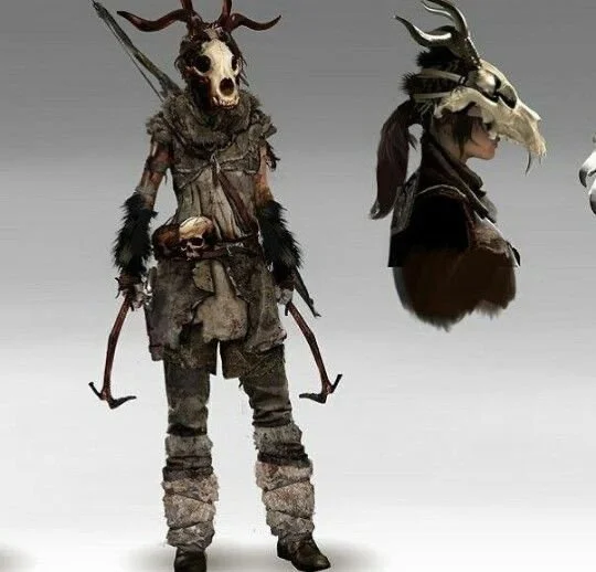 Fur mantles, stone-bead necklaces, carved wooden masks, tankards worn at the hip, and hexagonal tattoos resembling frost.